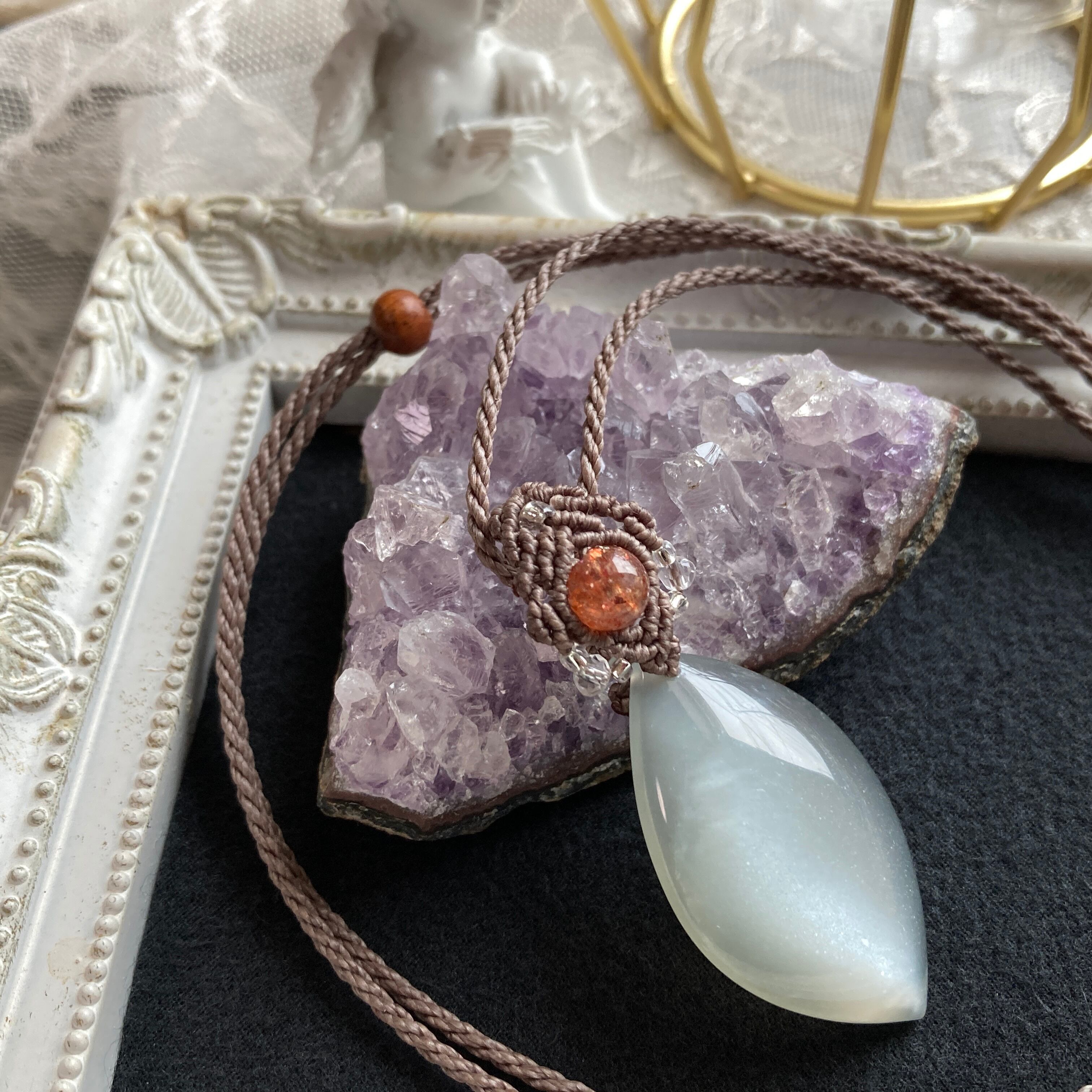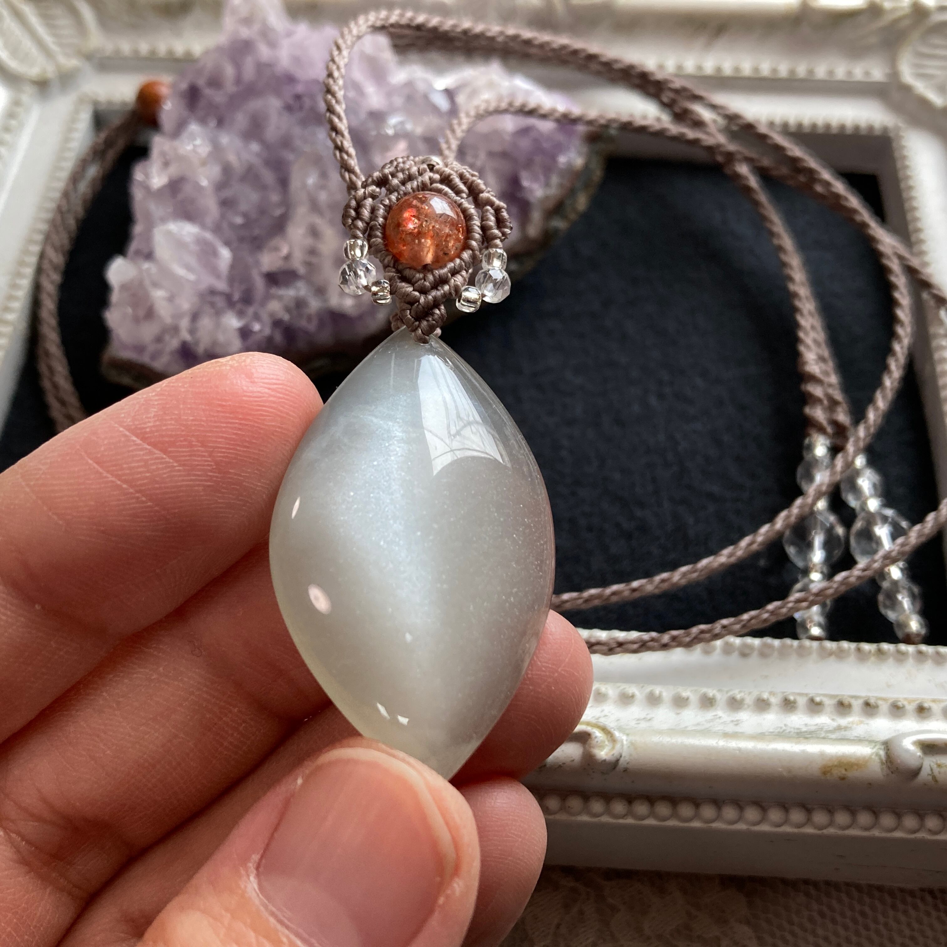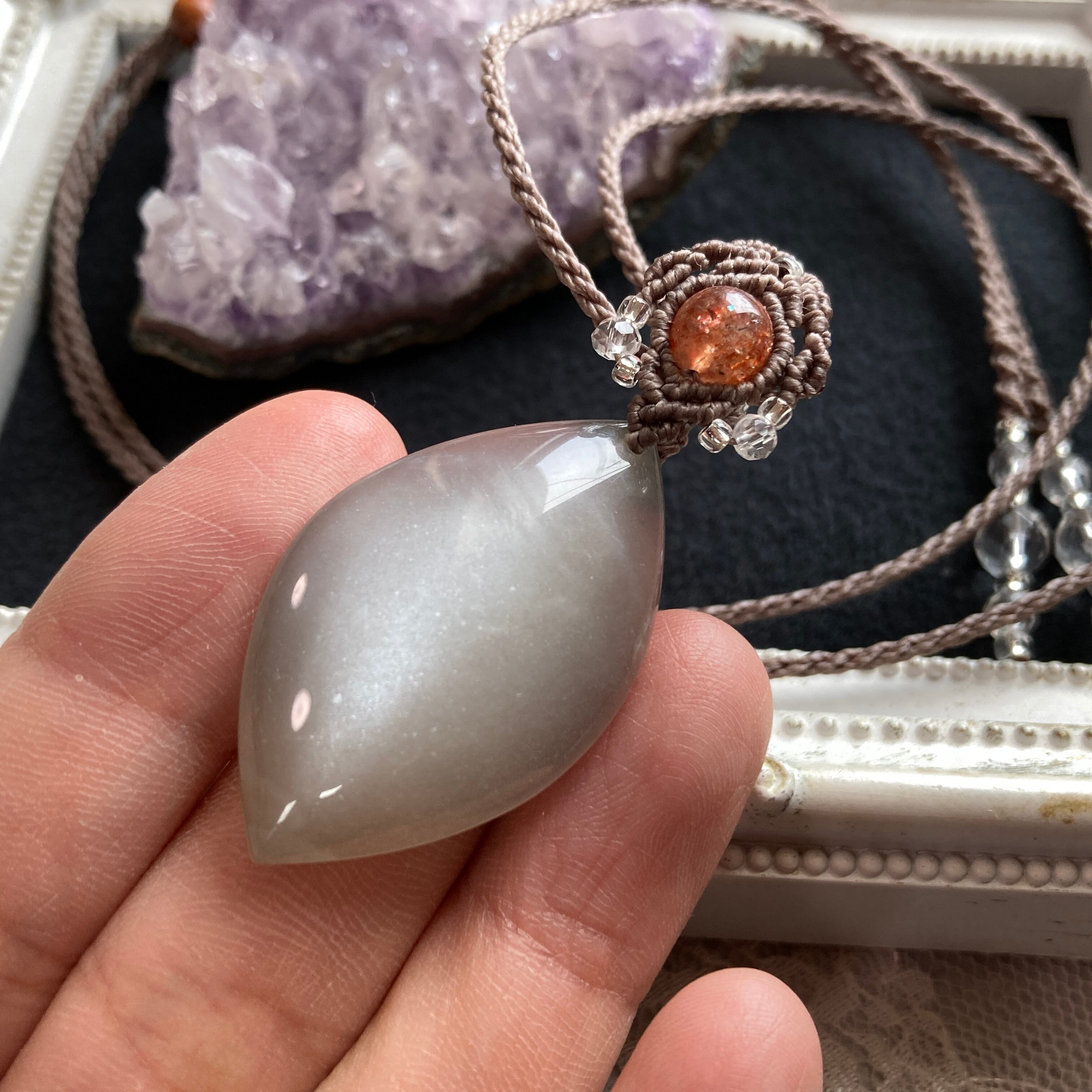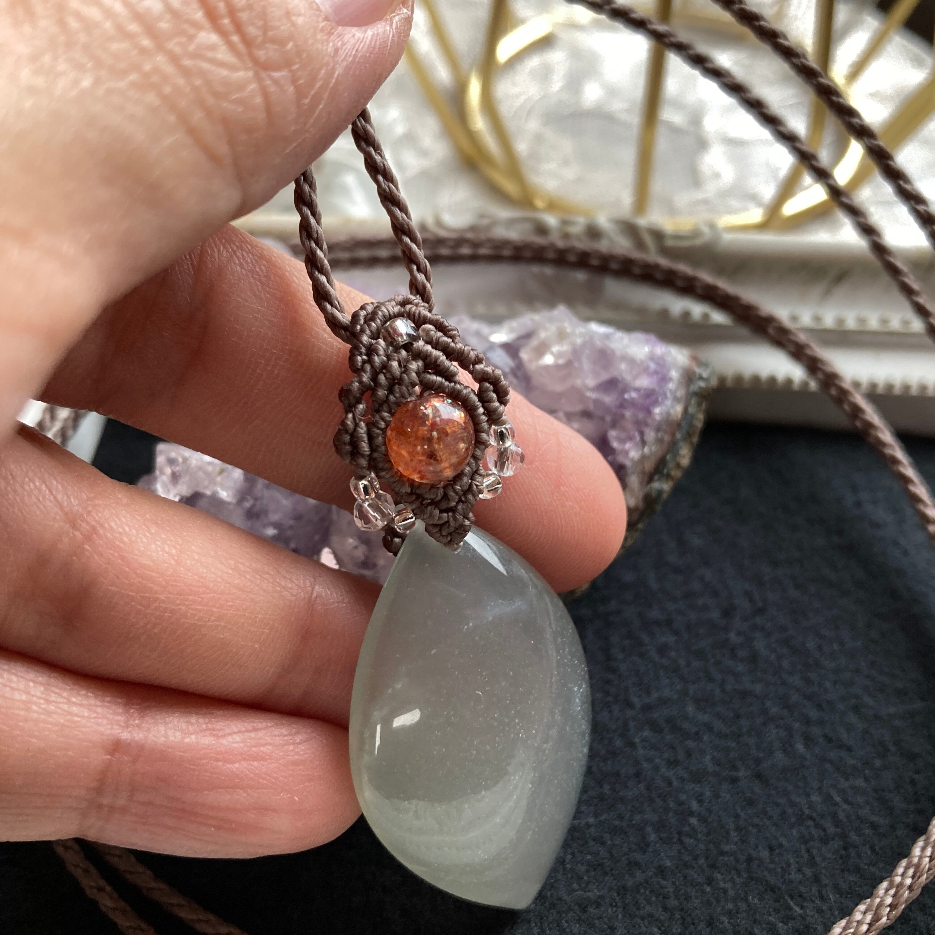 ムーンストーン(シルバーグレーカラー)×サンストーン 天然石マクラメ編みネックレス・天然石マクラメネックレス