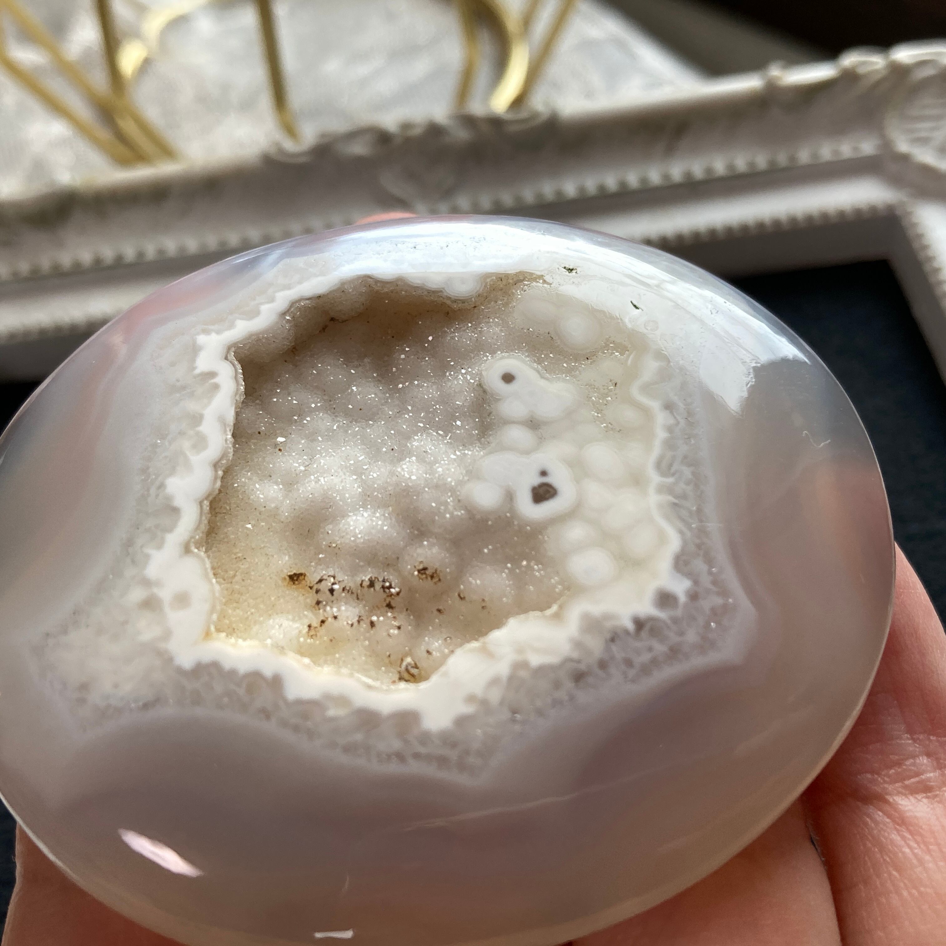 こちらはそんなボツワナアゲートの中央部分にドゥルージーが楽しめる大変個性的なルースです。