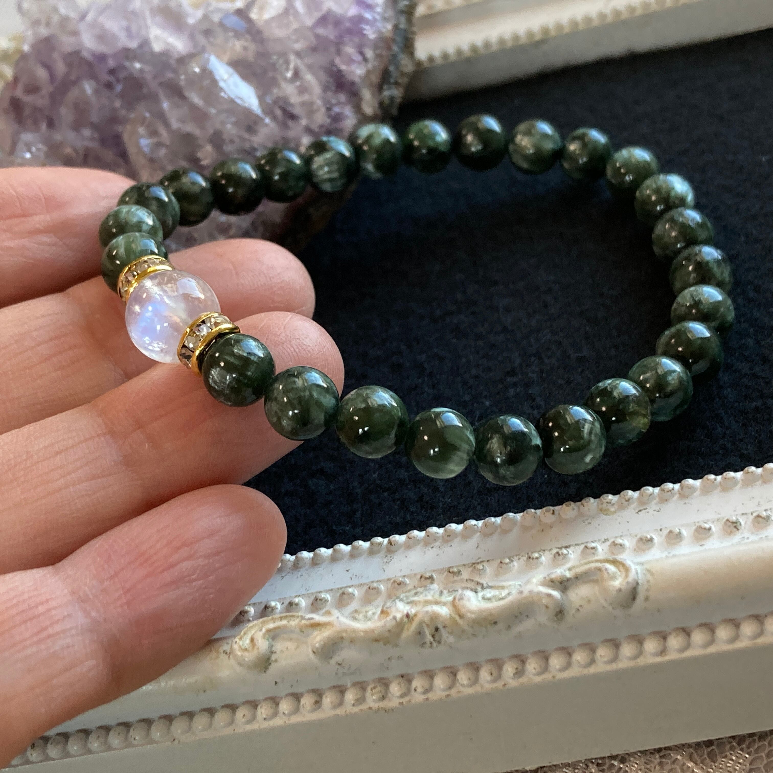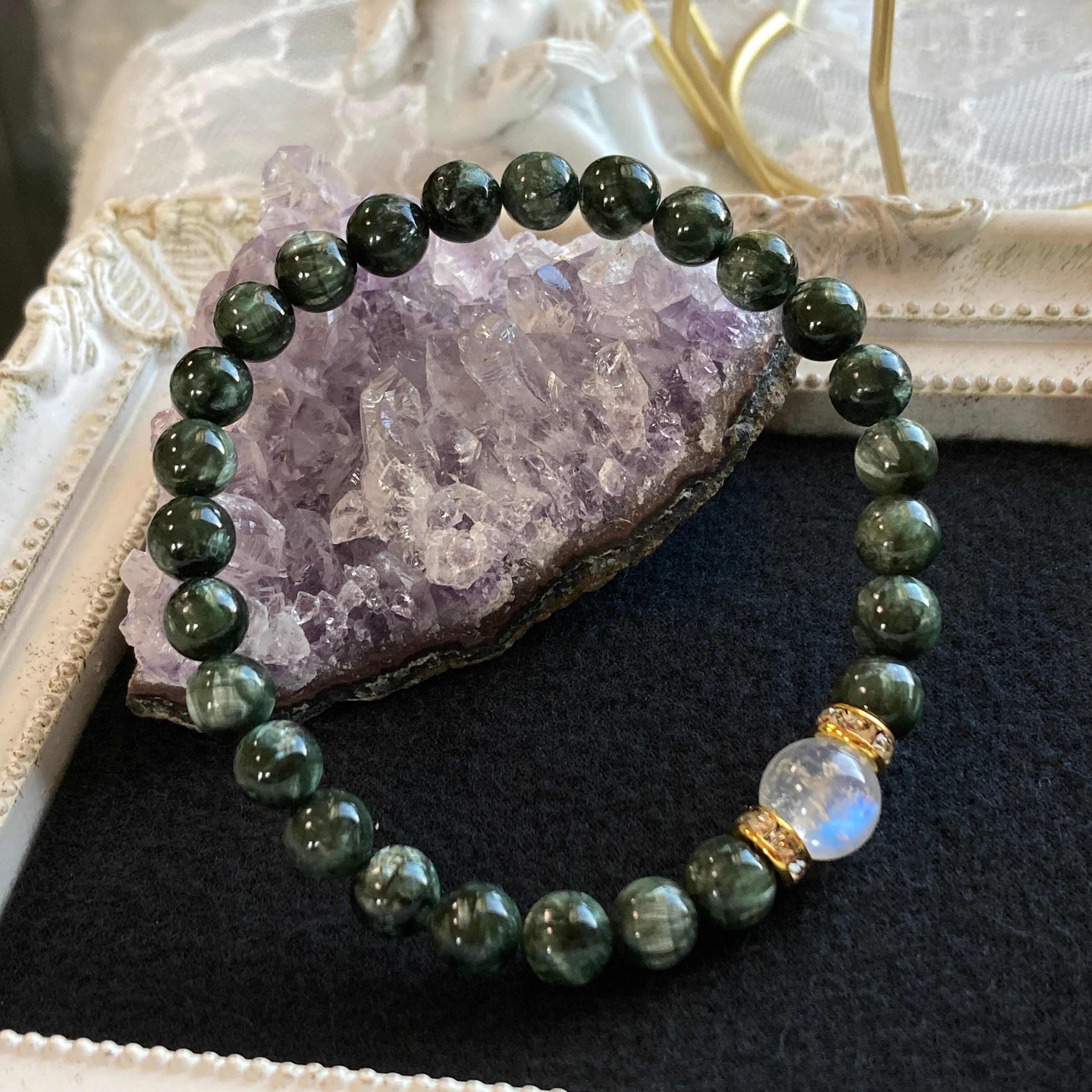※6.5mmサイズの小ぶりなセラフィナイトに、美しいレインボームーンストーンを合わせております。
