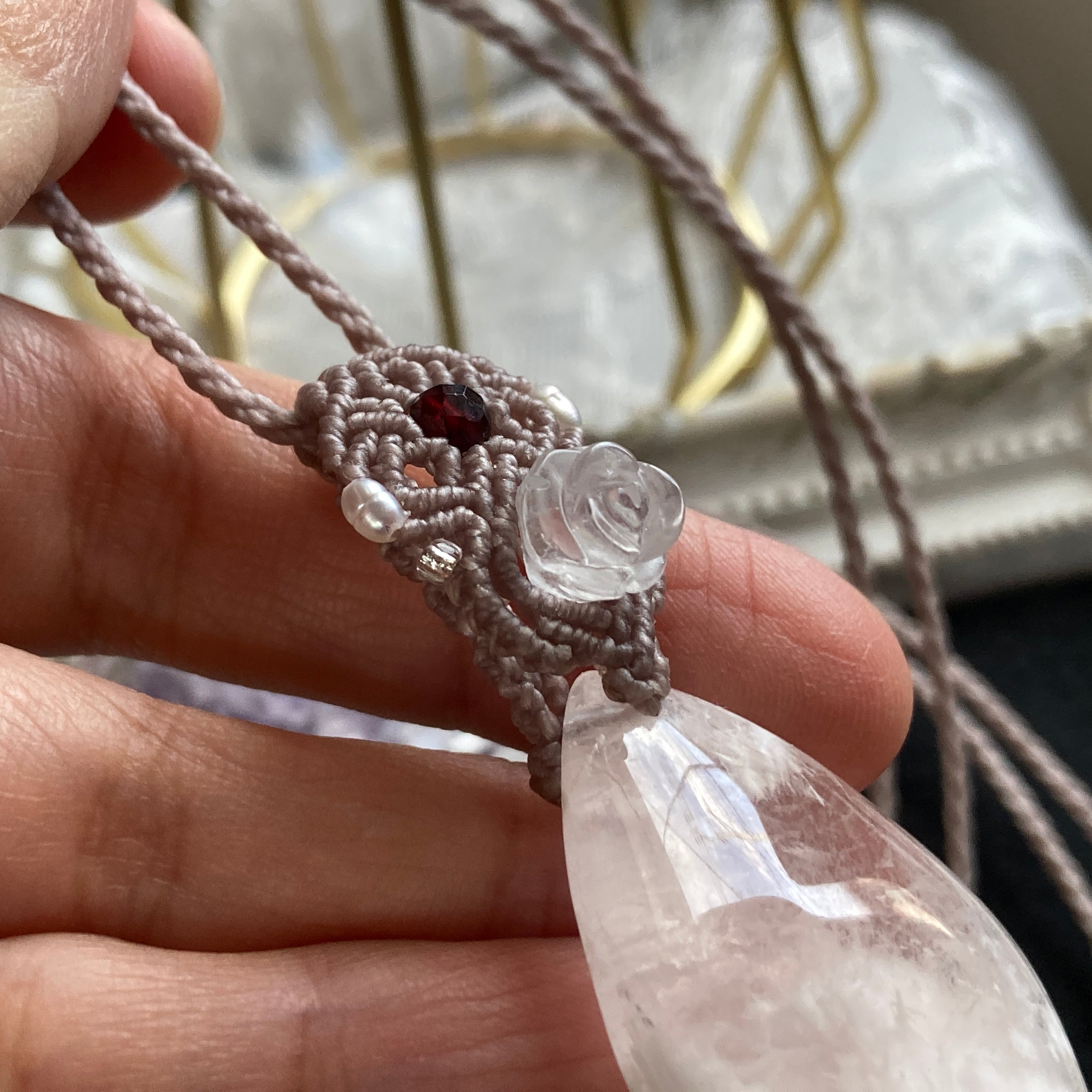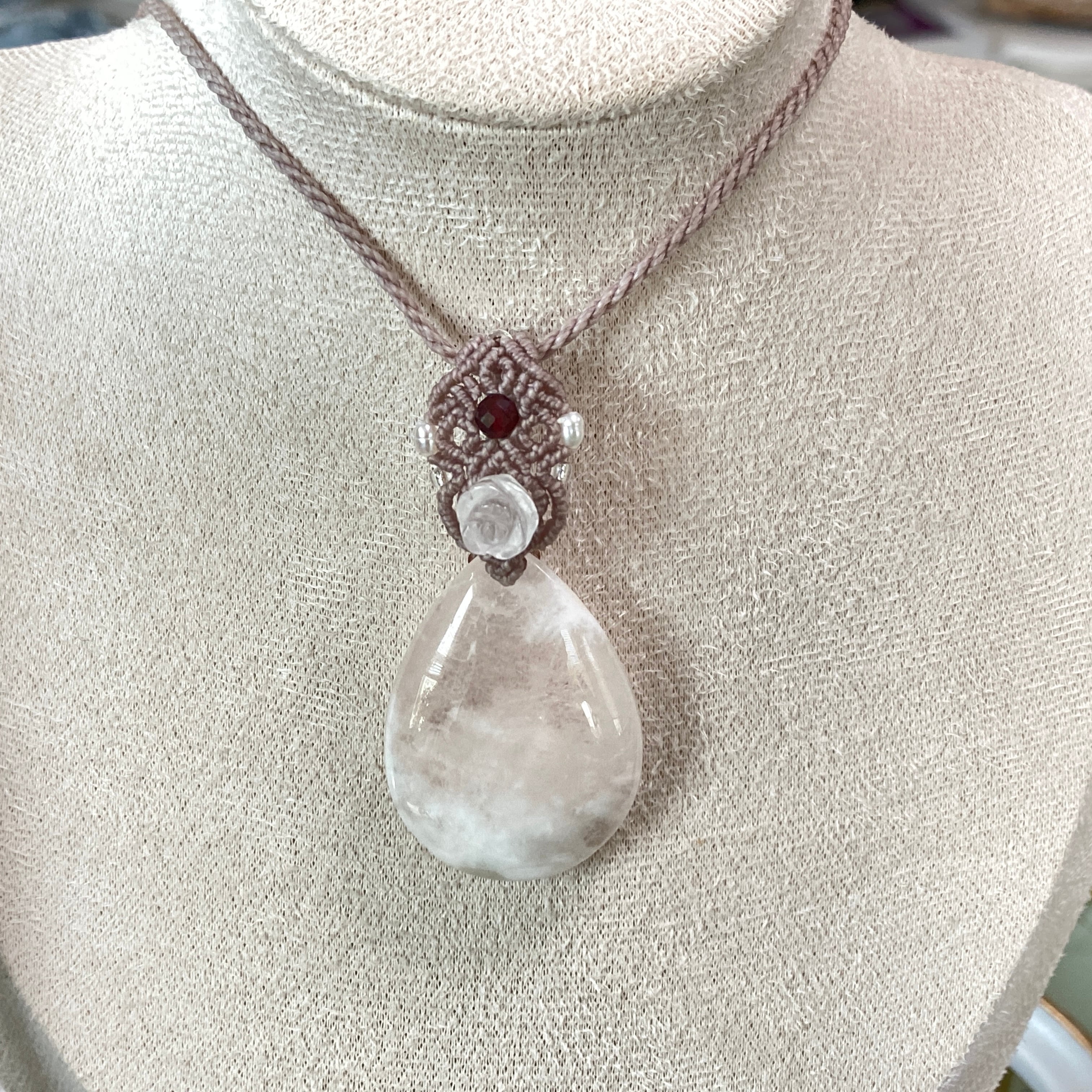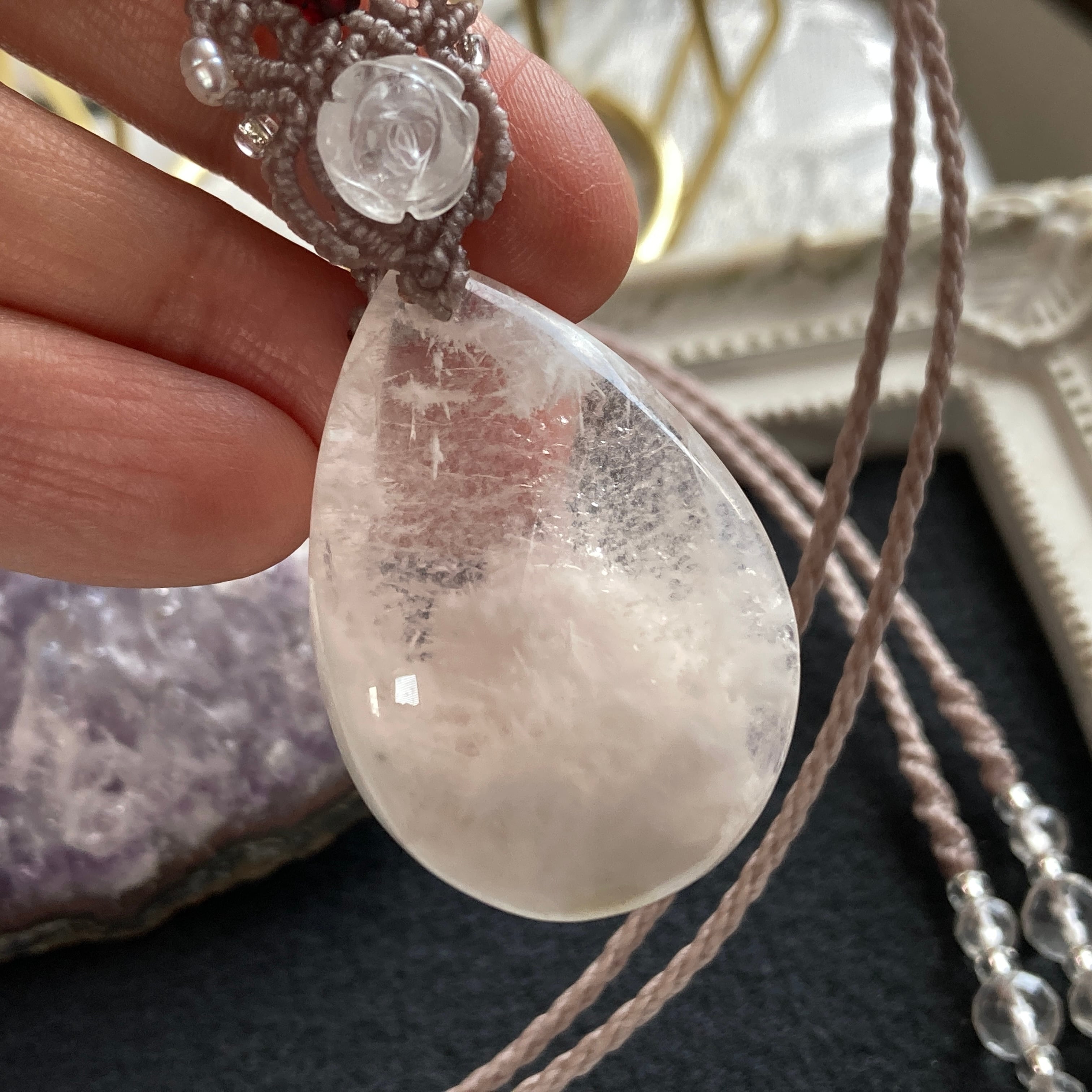 セリサイトインローズクォーツ・絹雲母インローズクォーツ マクラメネックレス・マクラメペンダントネックレス