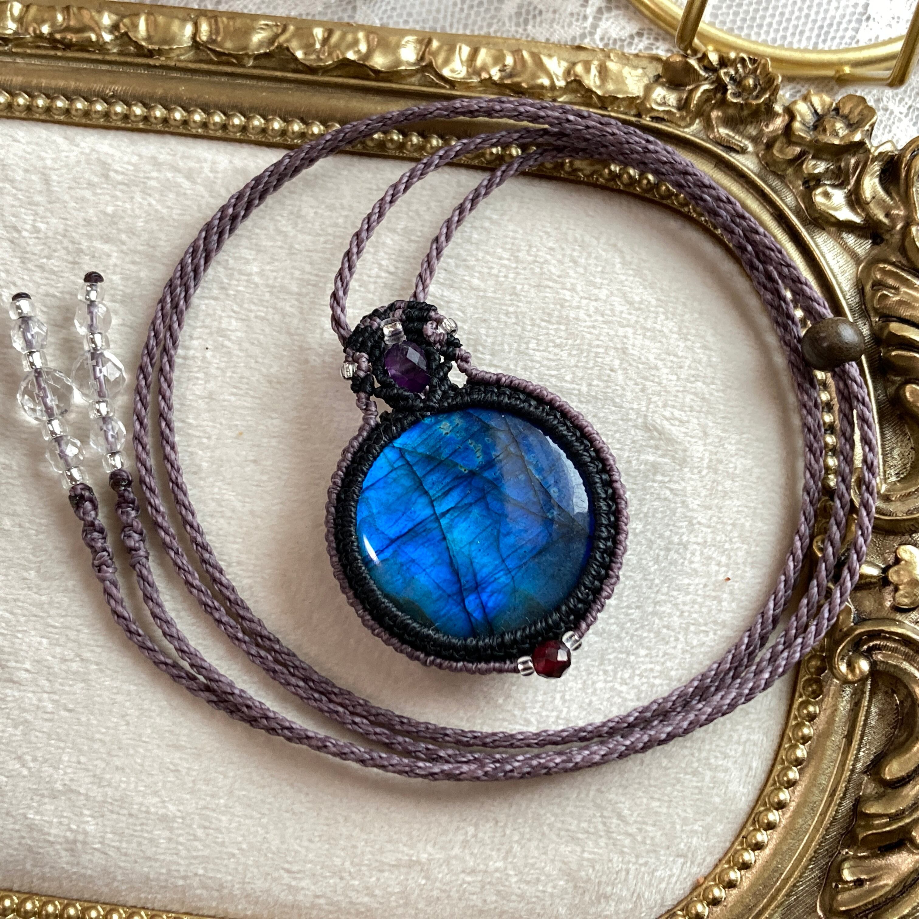 ブルーラブラドライト(サークル型) マクラメ編みネックレス ・金属アレルギー対応 ネックレス