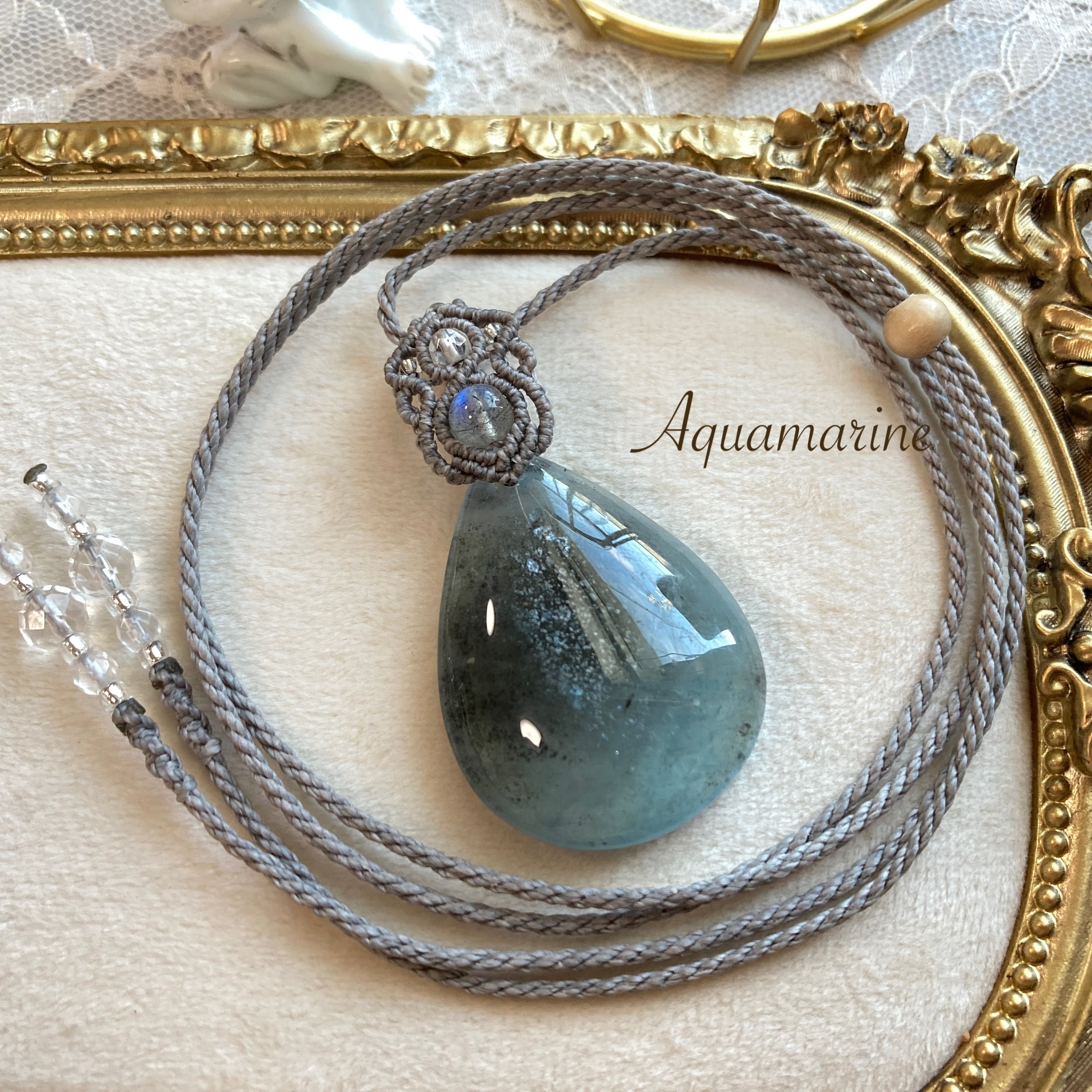 ブラックモス アクアマリン(大きめサイズ) マクラメネックレス 金属アレルギー対応 ネックレス