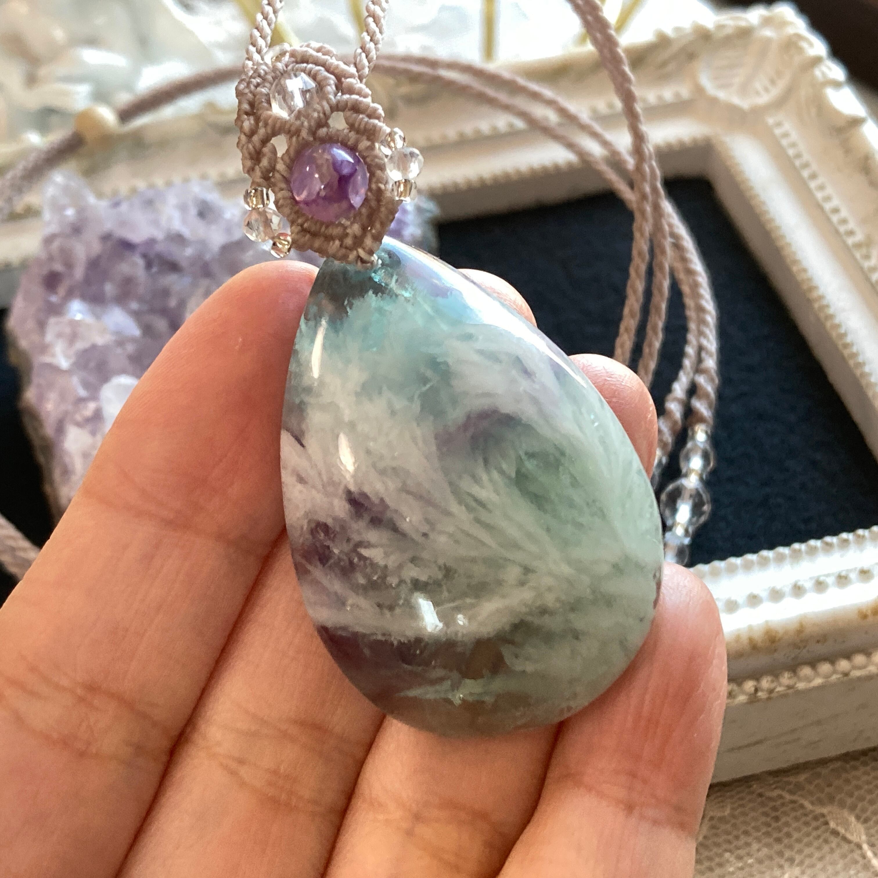 (フローライトに白い羽のようなインクルージョンが入った希少石)