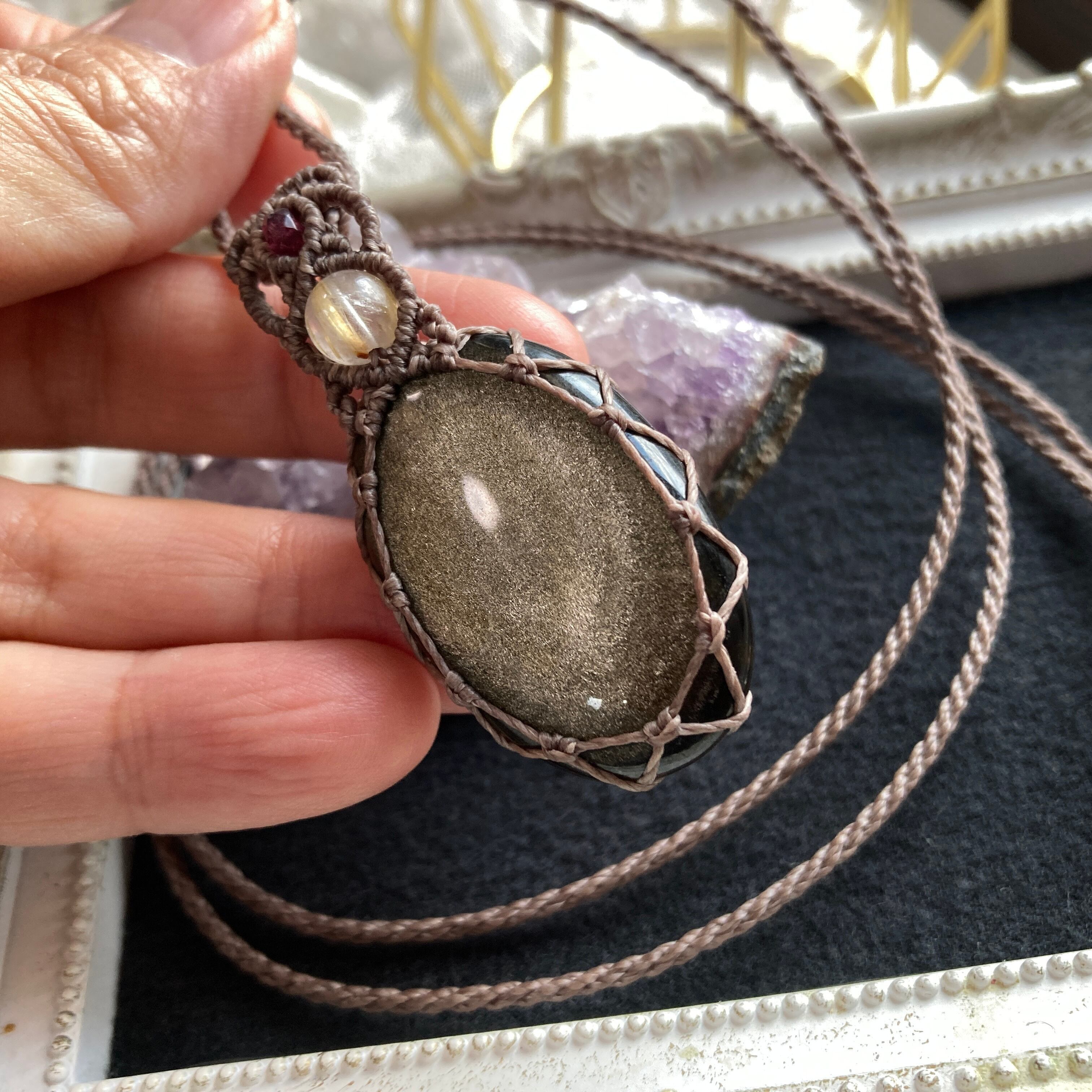 落ち着いた黒色のオブシディアンの雰囲気も素敵ですが、 角度をゆっくり変えるとゴールドの光彩が楽しめるとても美しいネックレスです。
