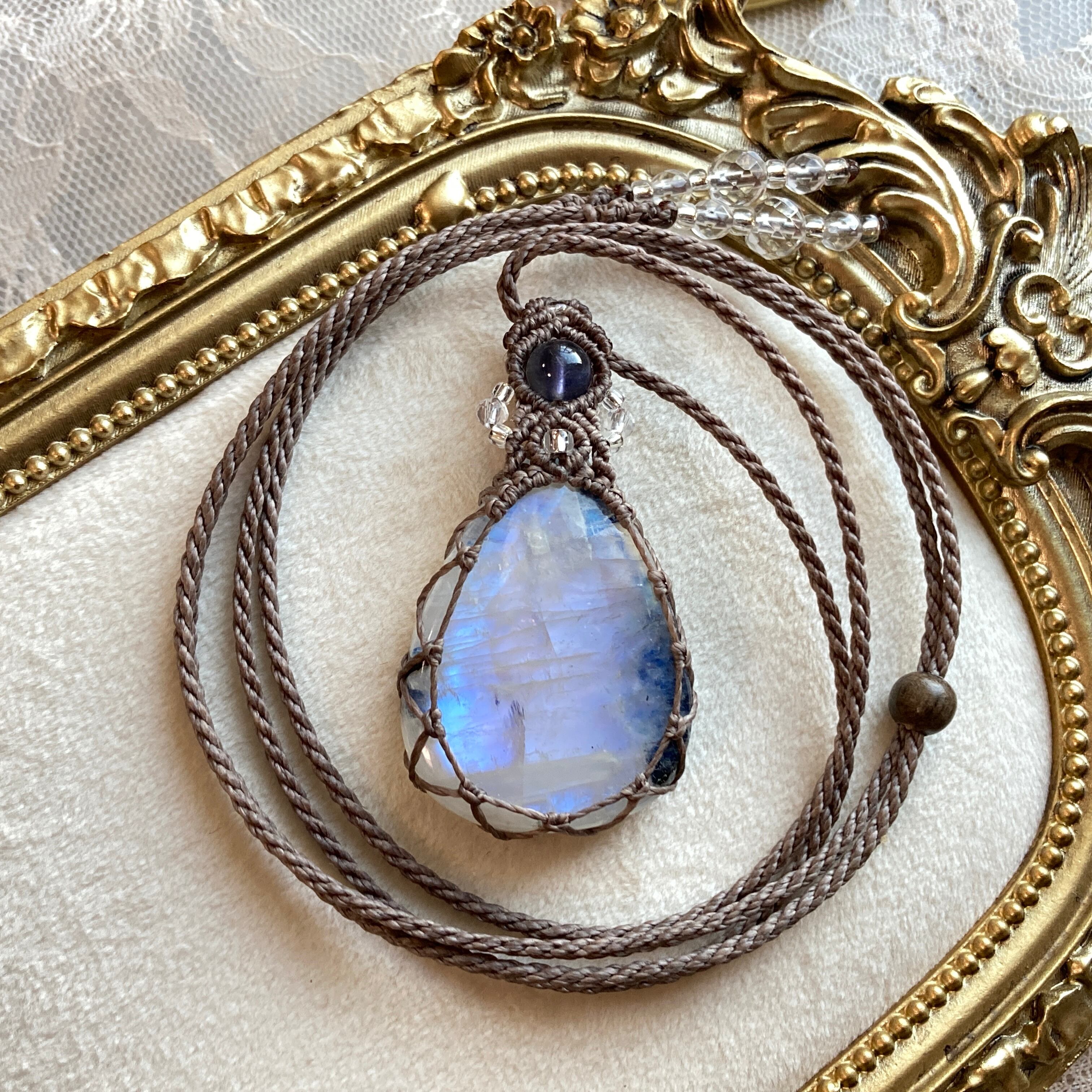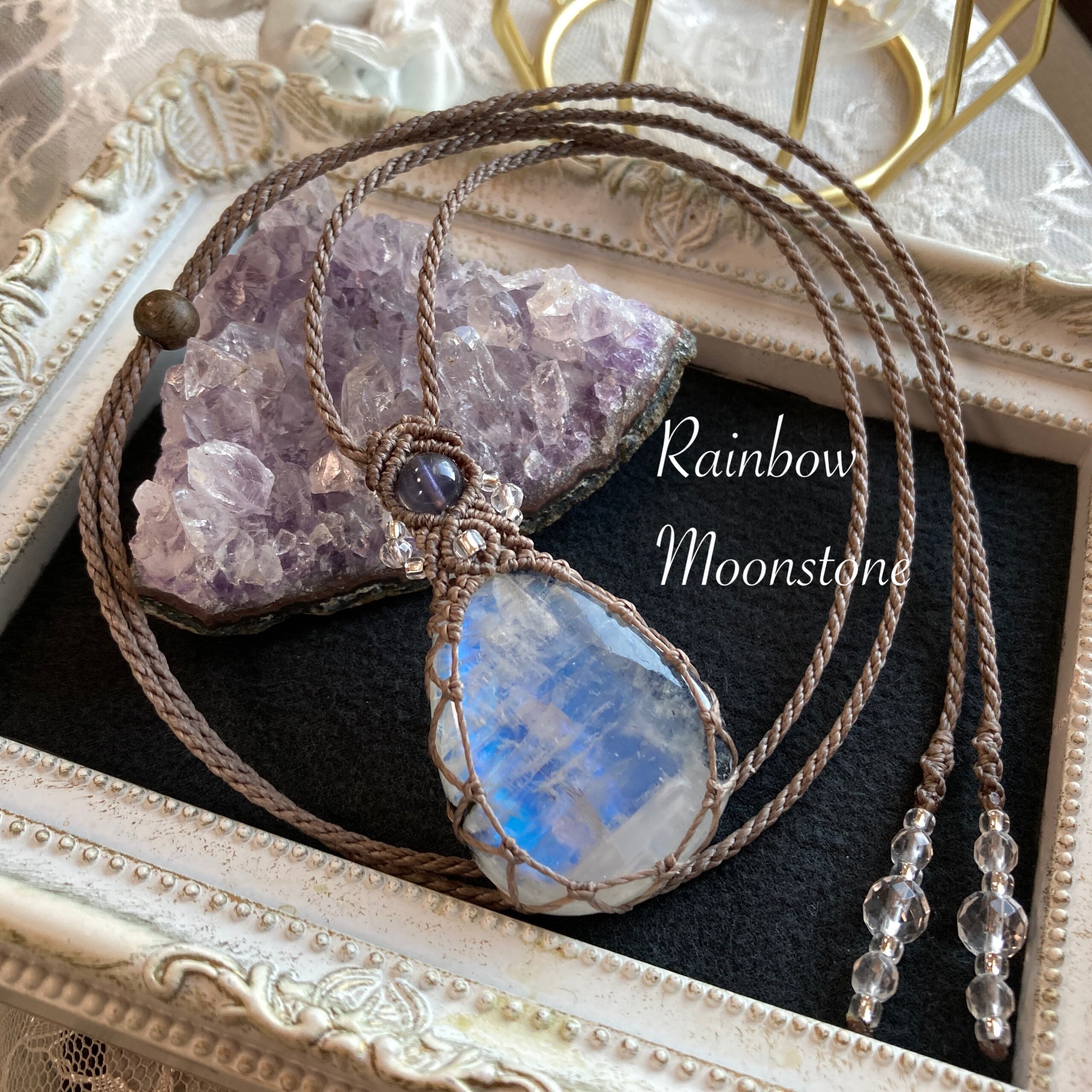 高品質☆レインボームーンストーン マクラメ編みネックレス ・金属アレルギー対応 ネックレス