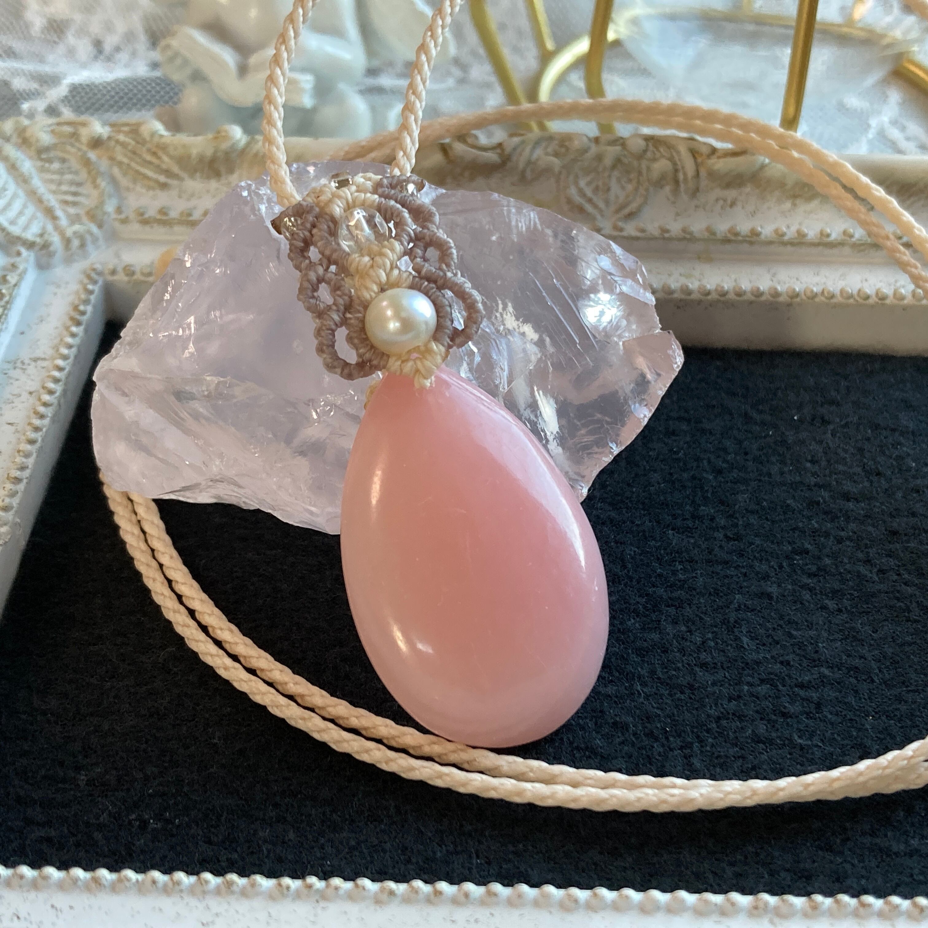 ペルー産☆ピンクオパール マクラメネックレス 金属アレルギー対応 ネックレス