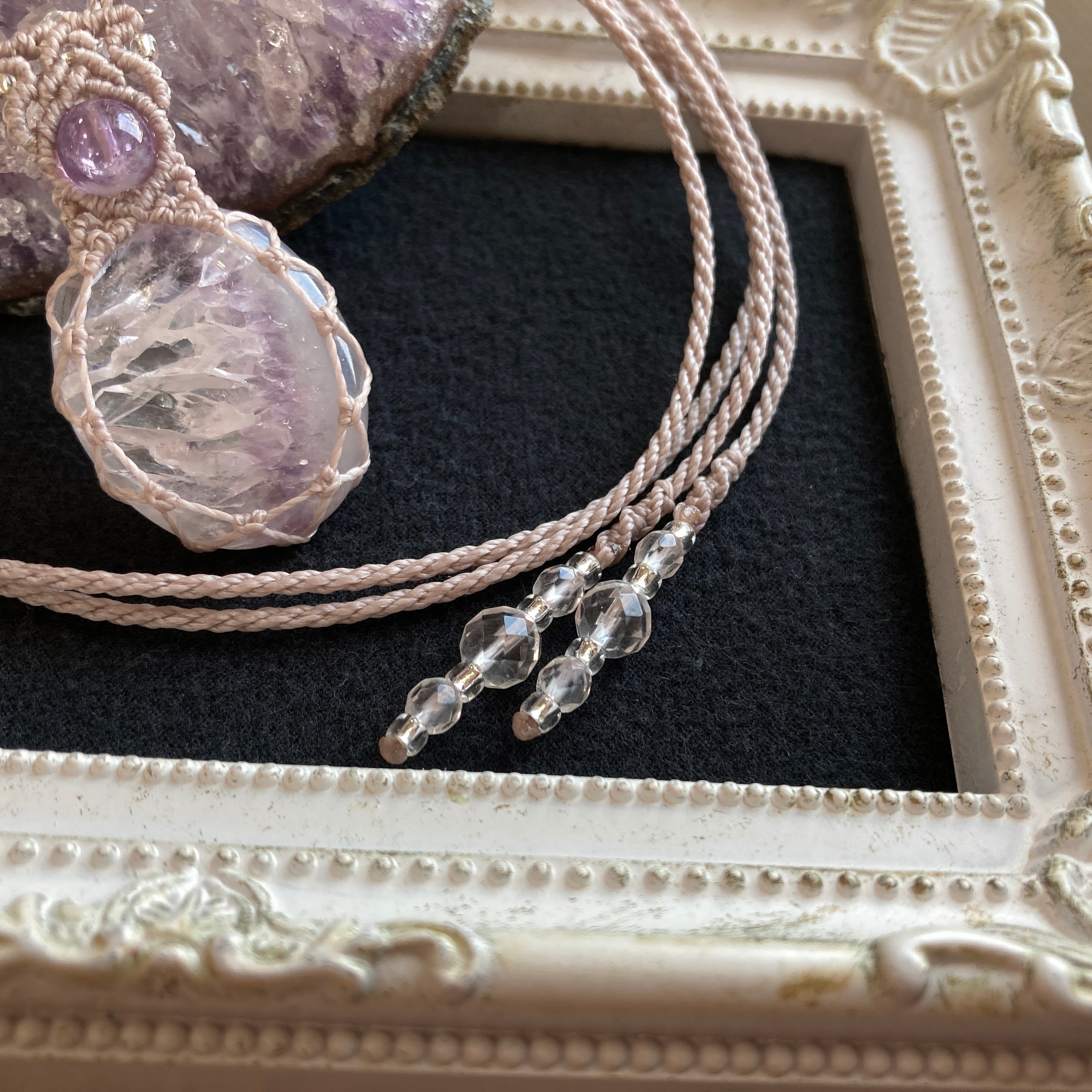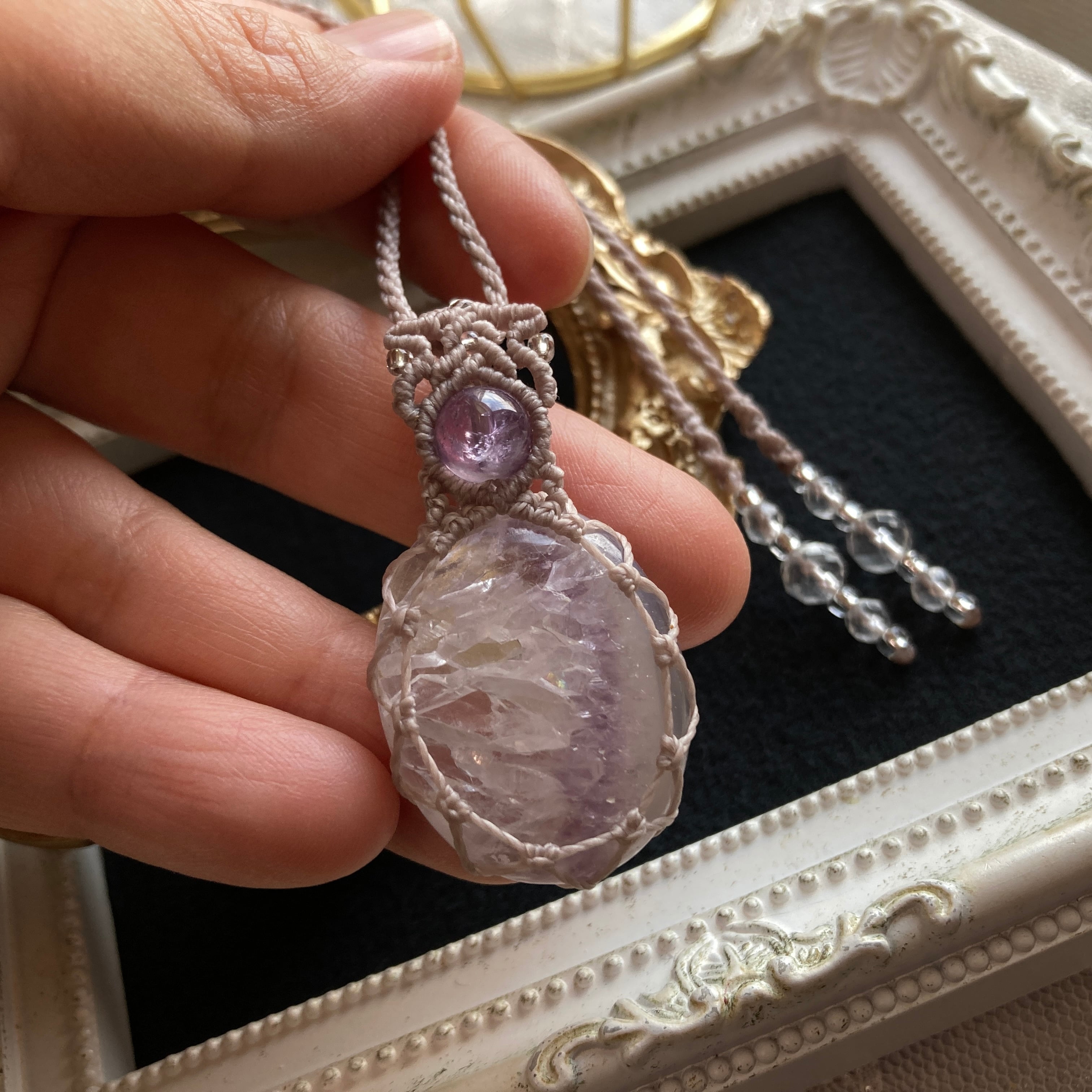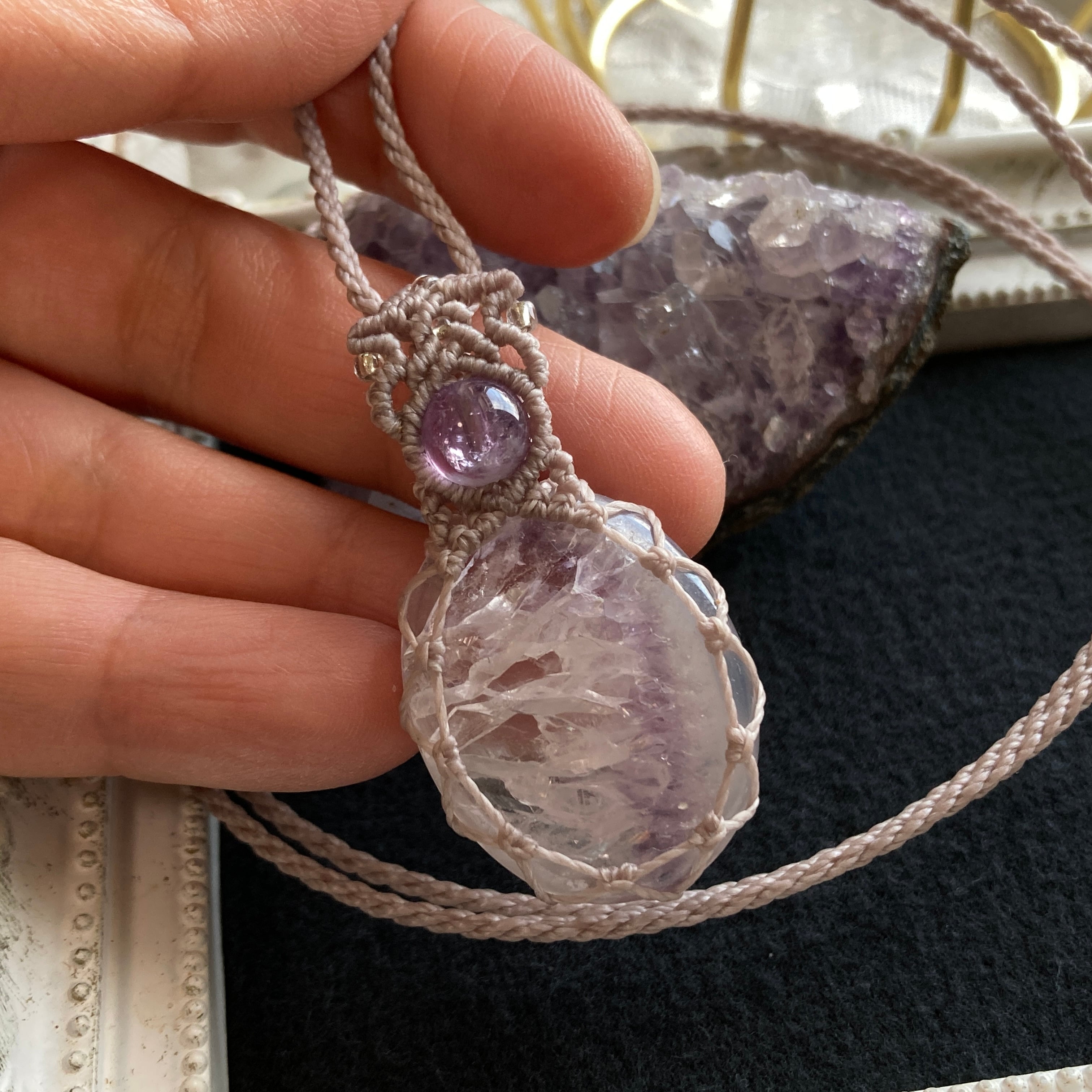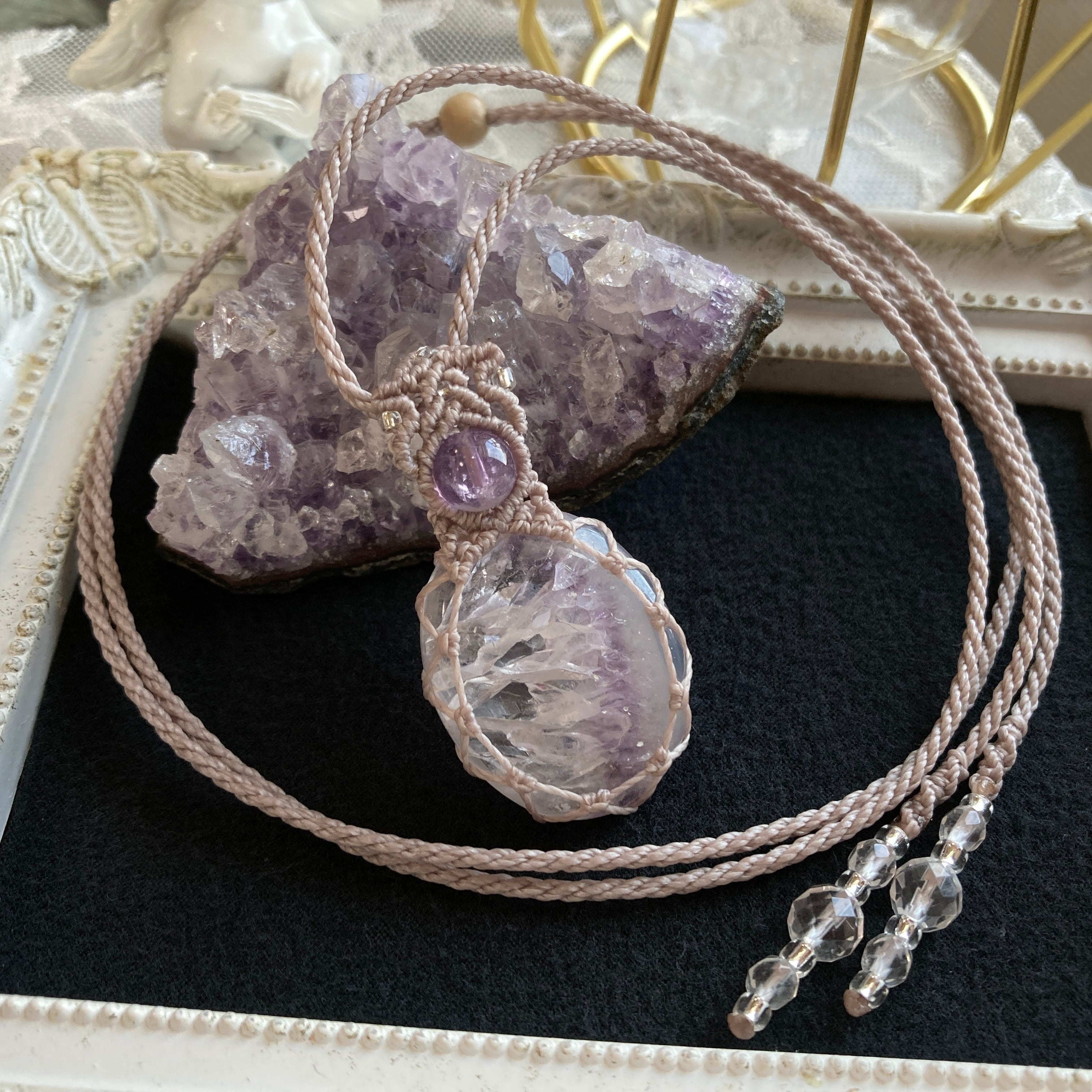 ※濃淡がとても美しいアメジストと、透明感のあるクォーツが結晶しており、さらにグレーの瑪瑙部分も楽しめる、表情豊かなルースをマクラメ ネックレスにお仕立てしております。