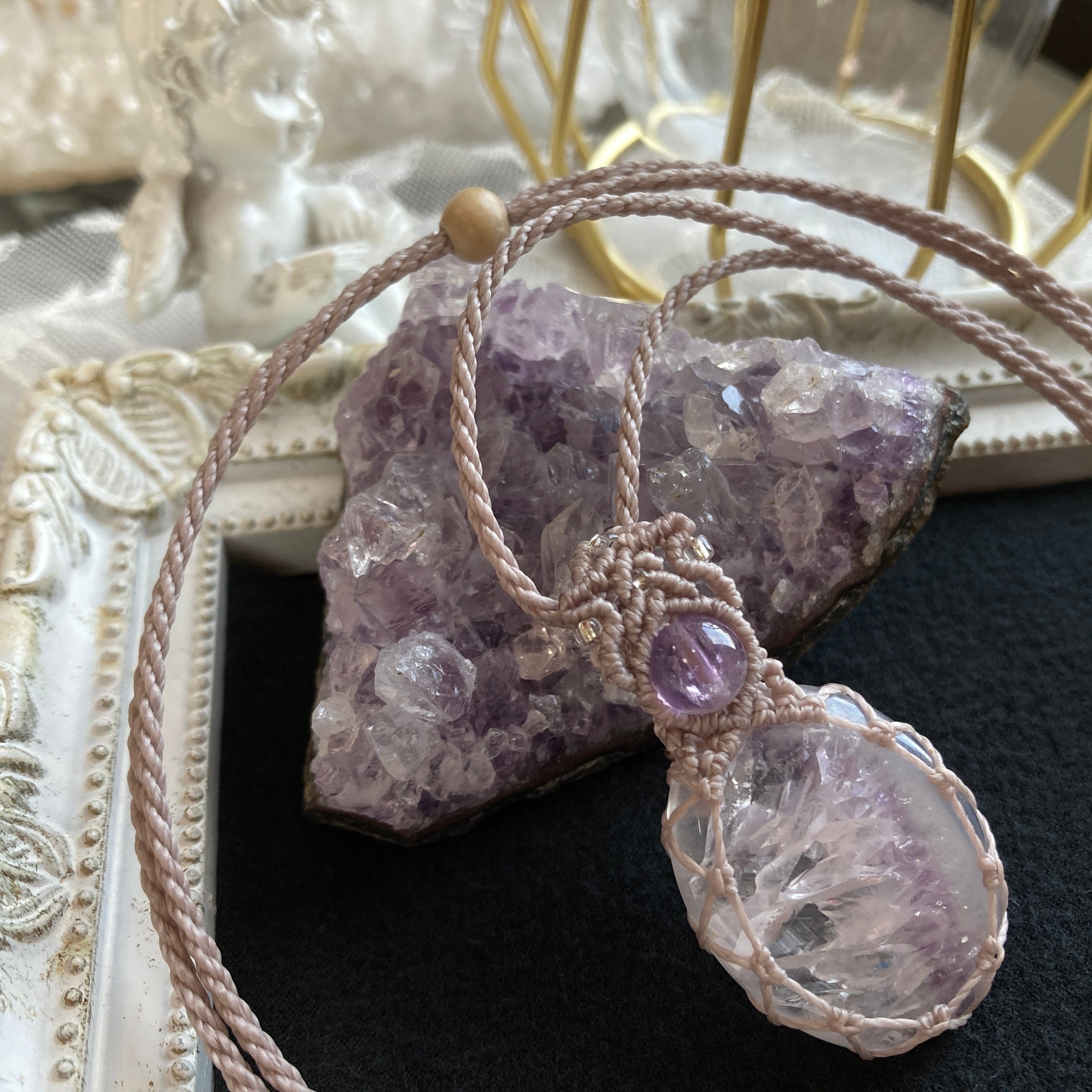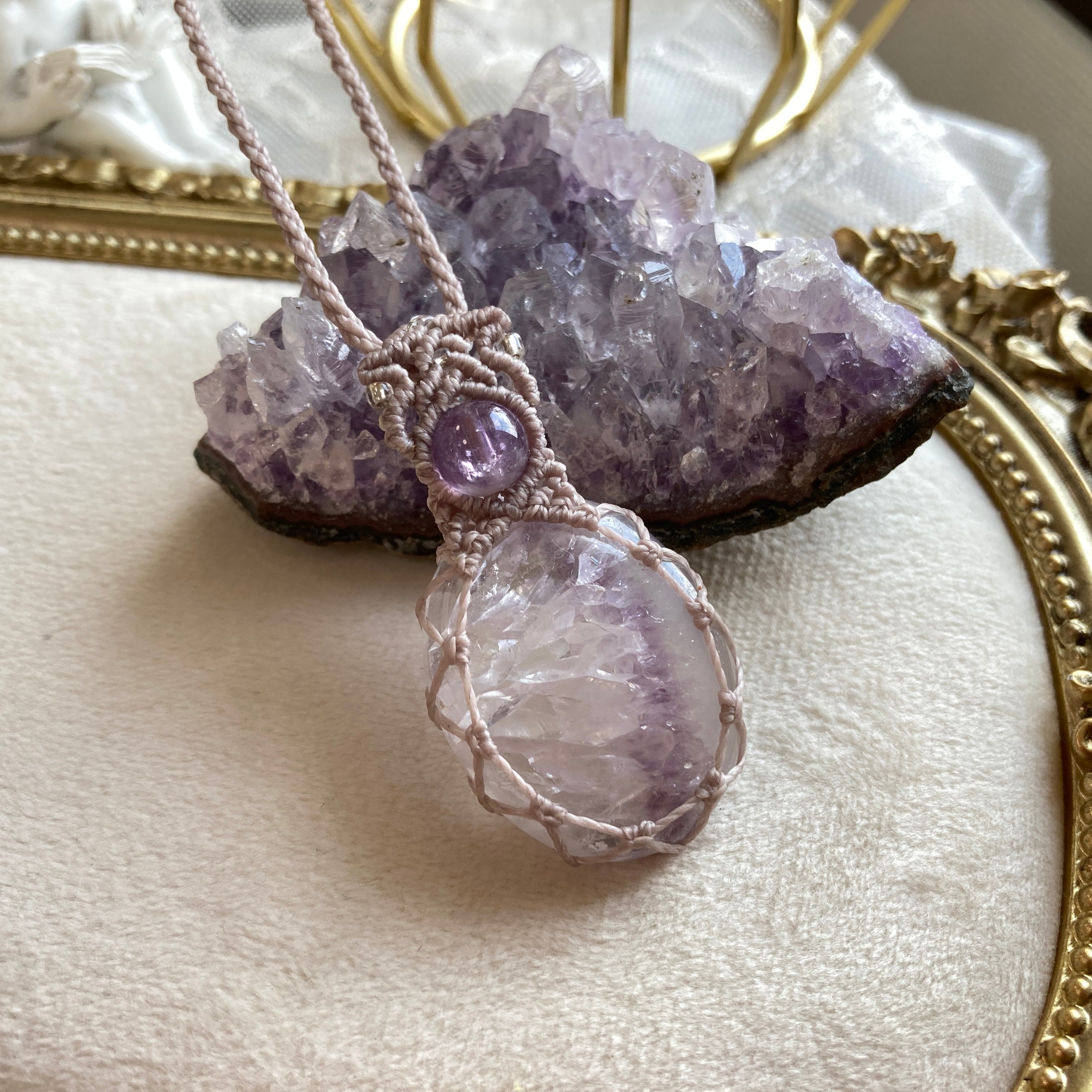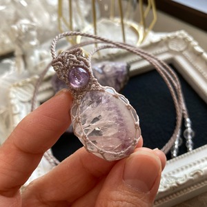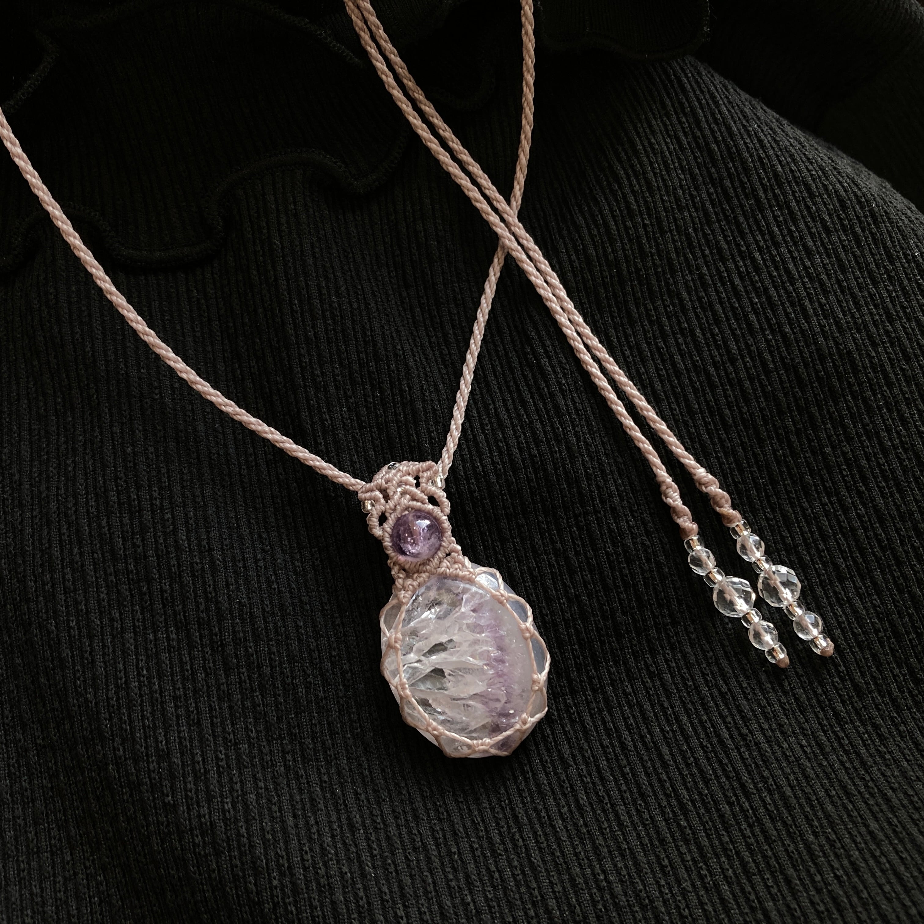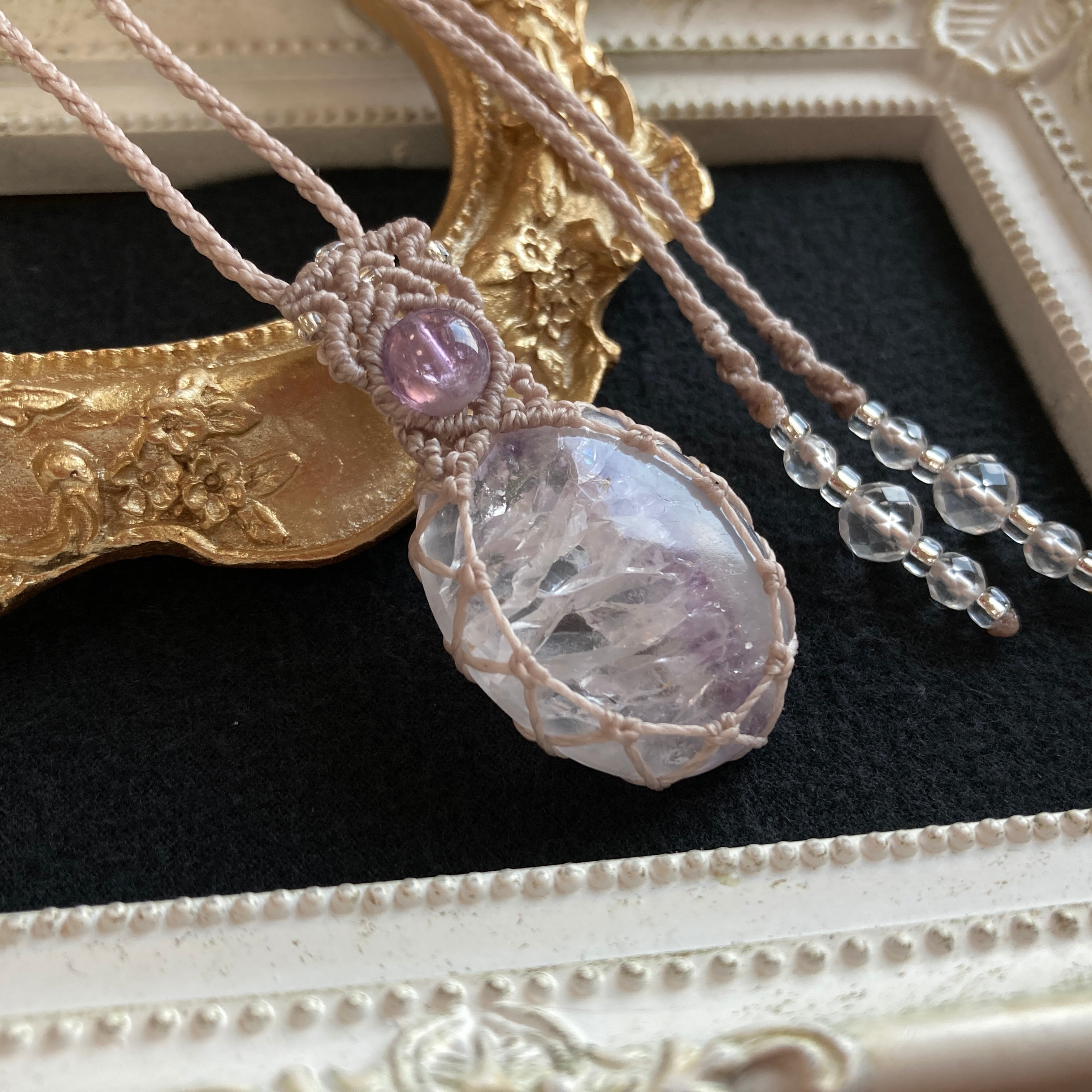 ※濃淡がとても美しいアメジストと、透明感のあるクォーツが結晶しており、さらにグレーの瑪瑙部分も楽しめる、表情豊かなルースをマクラメ ネックレスにお仕立てしております。