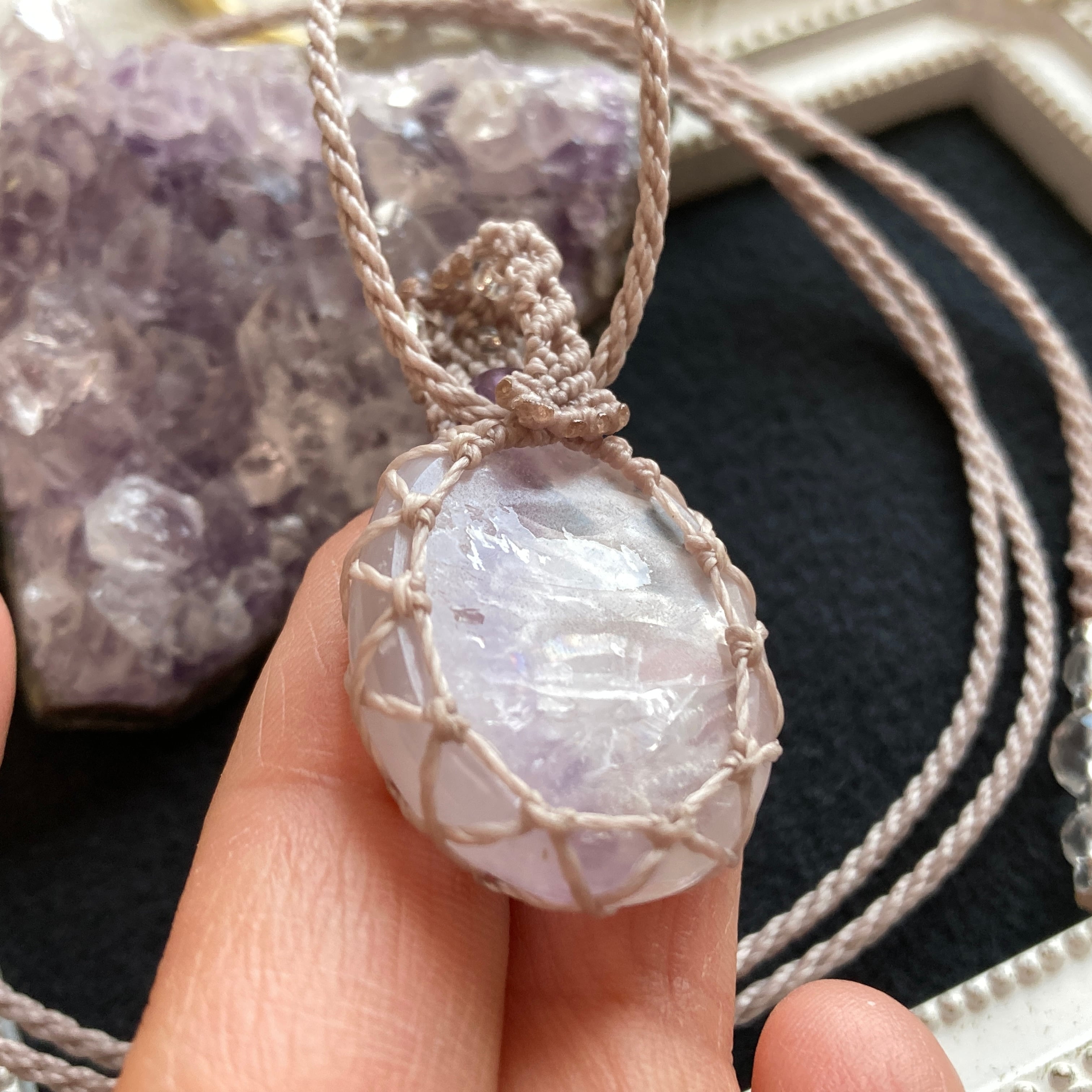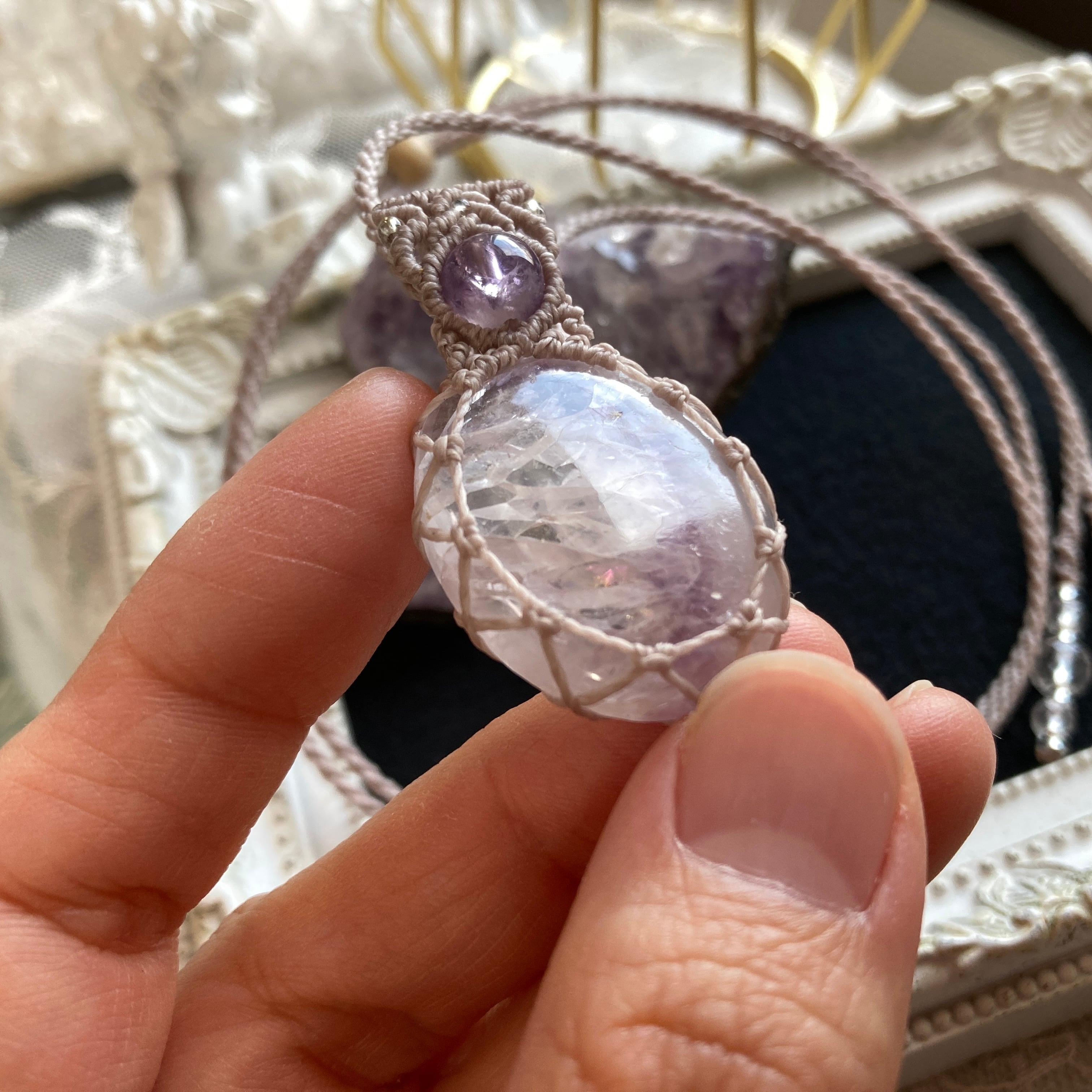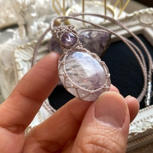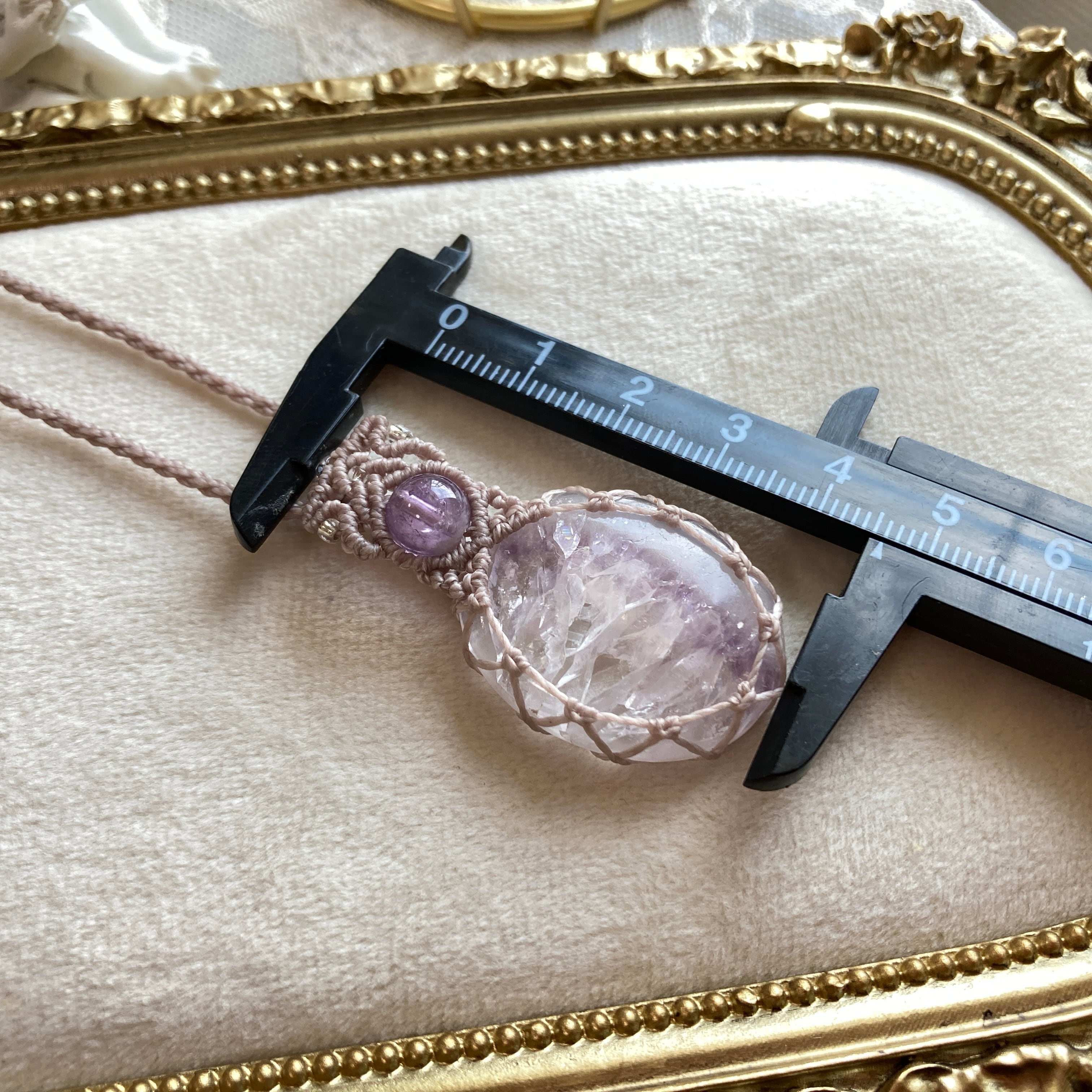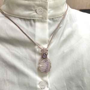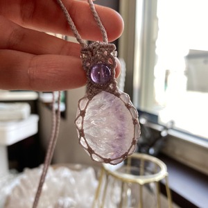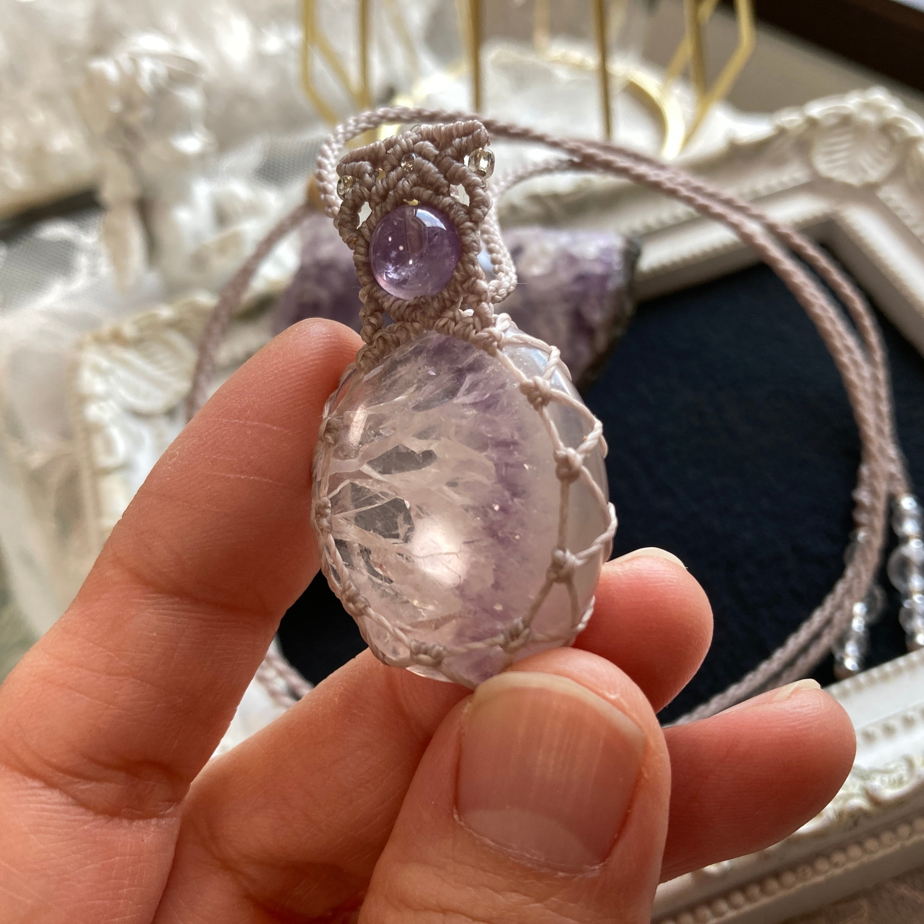 ※濃淡がとても美しいアメジストと、透明感のあるクォーツが結晶しており、さらにグレーの瑪瑙部分も楽しめる、表情豊かなルースをマクラメ ネックレスにお仕立てしております。