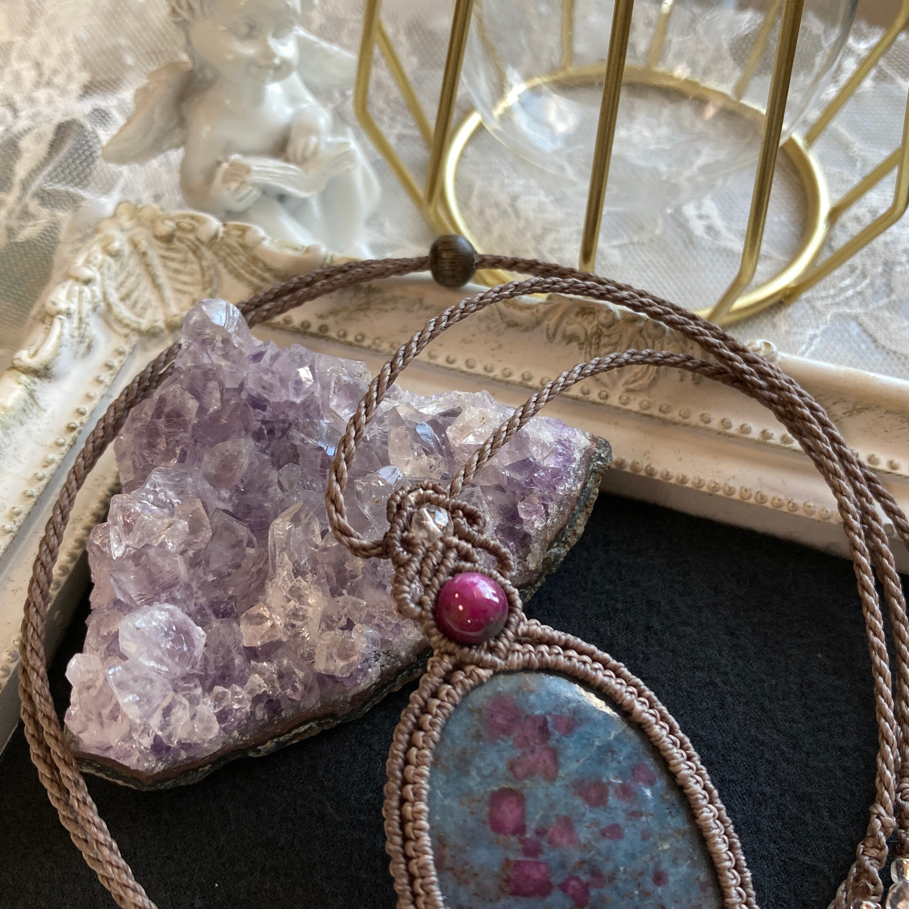 ※こちらの商品はペンダントトップに、マクラメ編みの首紐をおつけしており、
