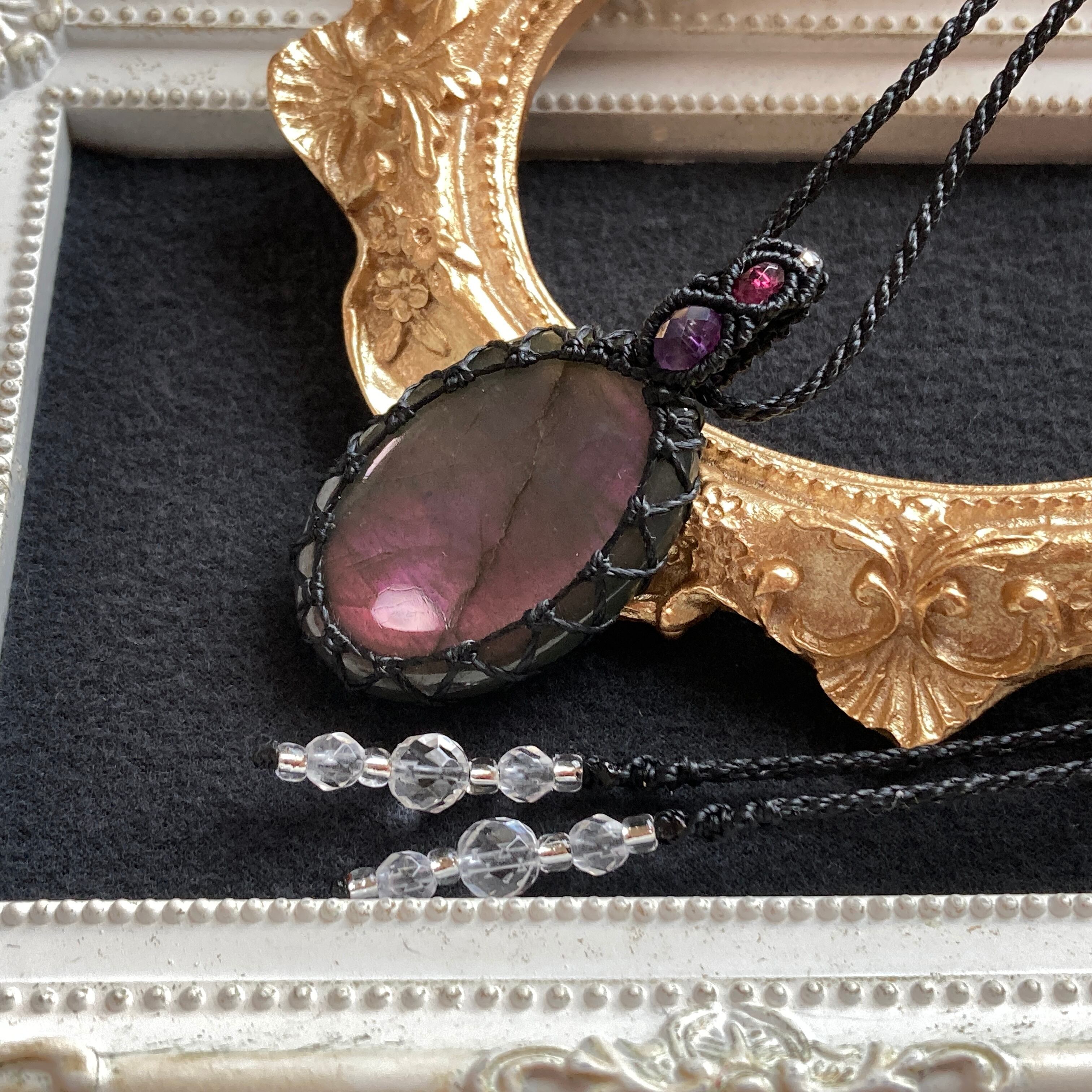 ※シラーが美しいラブラドライトのルースをマクラメ編みのネックレスに加工しております。
