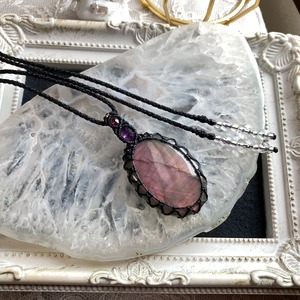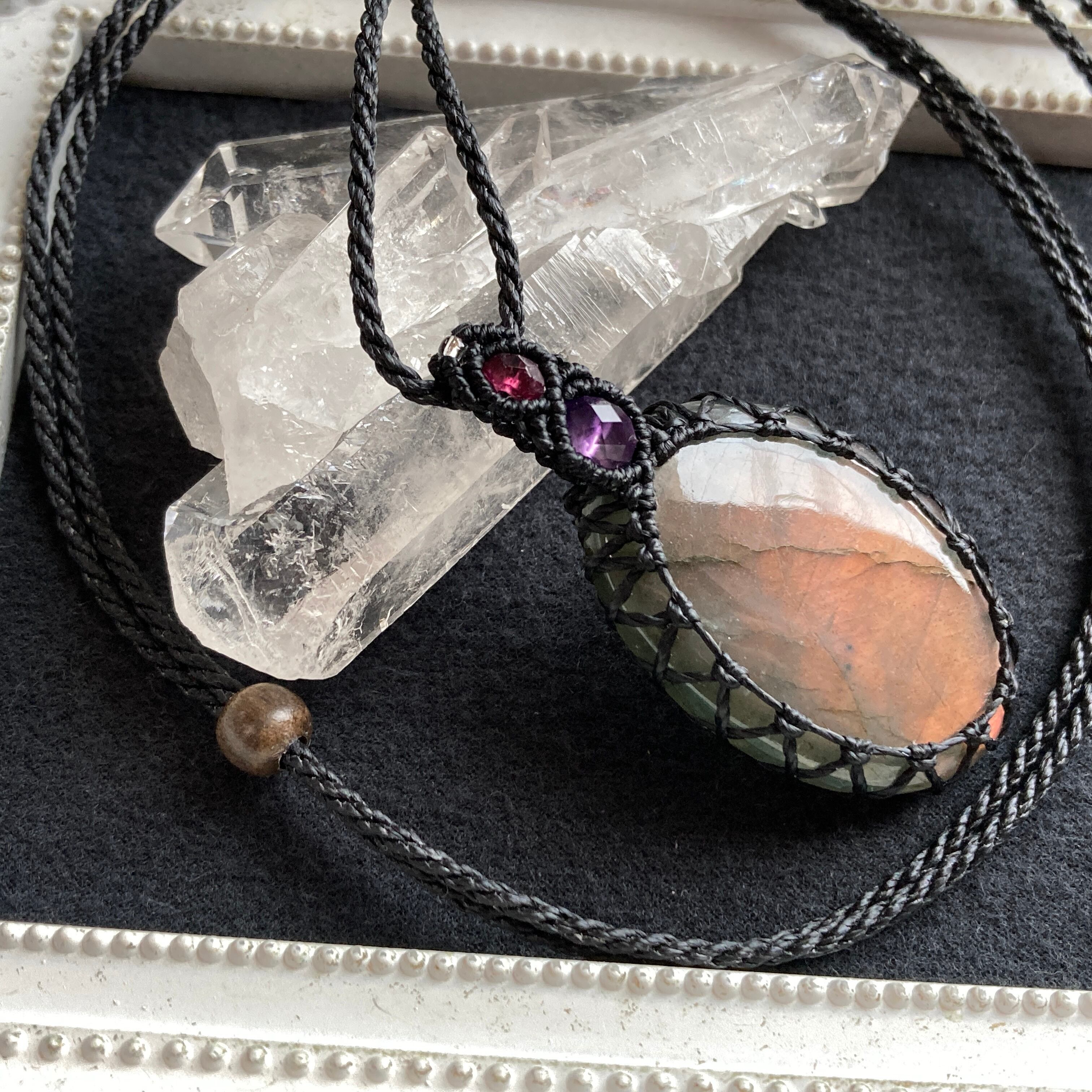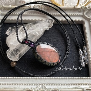 ラブラドライト(オレンジ〜パープルピンク)マクラメ編みネックレス・マクラメネックレス